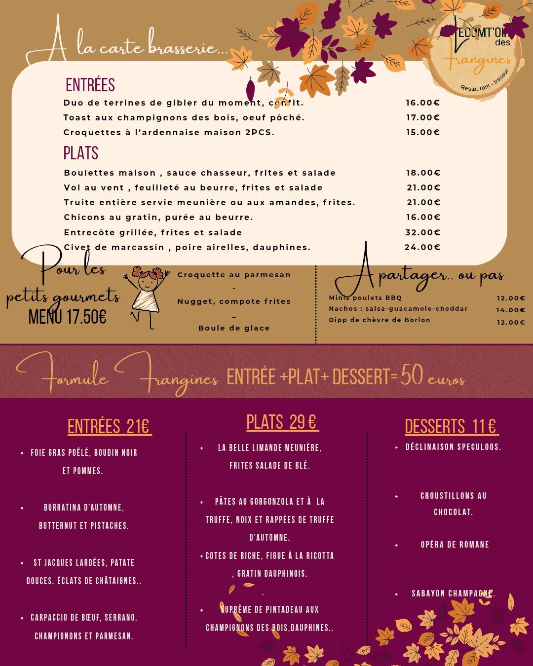 Une carte renouvelée tous les mois, des produits frais, une cuisine faite maison, voilà la signature du restaurant Le Comt’oir des Frangines situé à Durbuy. Ce restaurant chaleureux et accueillant vous propose de venir savourer de délicieux repas sur place ou bien d’opter pour leur système de click and collect. Quelle que soit l’option pour laquelle vous opterez, notre restaurant vous garantit une expérience gourmande. Le petit plus de notre enseigne ? Nous proposons également un service de traiteur !